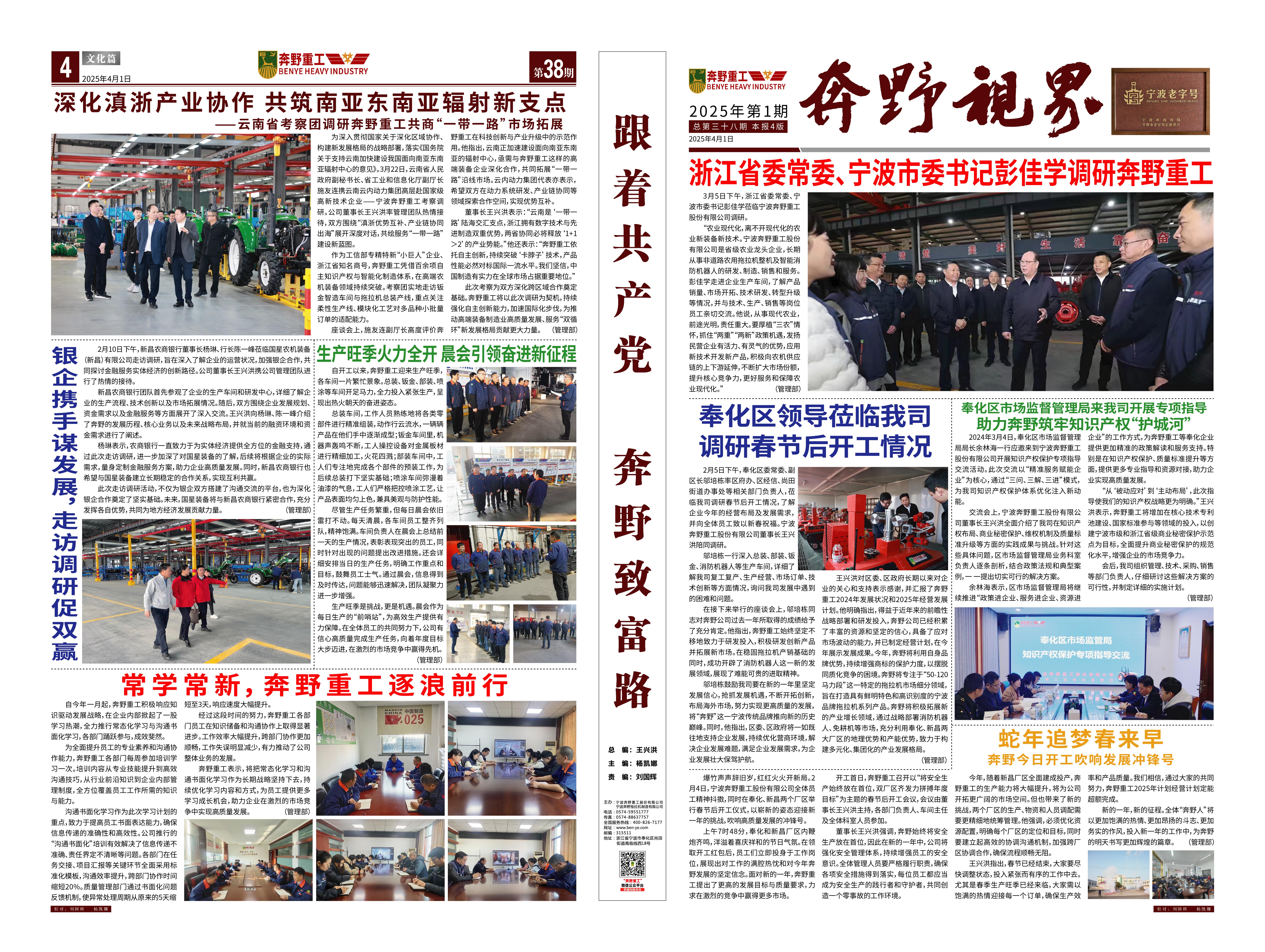 是一家非道路用農(nóng)用拖拉機整機及部件設(shè)備研發(fā)、制造、銷售、服務(wù)為一體的涉農(nóng)科研型生產(chǎn)企業(yè),專業(yè)生產(chǎn)寧波型奔野系列拖拉機,是國家高新技術(shù)企業(yè)、工信部專精特新“小巨人”企業(yè)、浙江省知名商號,寧波市級農(nóng)業(yè)龍頭企業(yè)、脫貧攻堅-產(chǎn)業(yè)合作樣板企業(yè)、鄉(xiāng)村振興先進集體,在寧波、新昌、吉林等地均設(shè)有生產(chǎn)基地,占地150多畝。公司現(xiàn)有技術(shù)骨干30多人,零部件自制化水平達到30%以上。公司目前擁有發(fā)明專利10余項,實用新型專利、外觀專利、版權(quán)近50項,擁有自主的知識產(chǎn)權(quán)保護品牌。公司所處的農(nóng)業(yè)農(nóng)機領(lǐng)域是國家重點關(guān)注和保障的、關(guān)乎國計民生的領(lǐng)域,得到國家和地方政府的大力支持,行業(yè)發(fā)展勢頭良好。